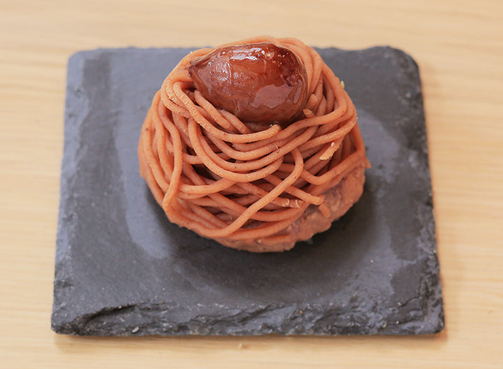 宇治抹茶を贅沢に使用し、独特のうまみと苦みの餡に仕上げました。黒米おはぎ餅に絞り、モンブランにしました。